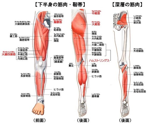 - ふくらはぎ(下腿三頭筋)地面を蹴り返す役割。