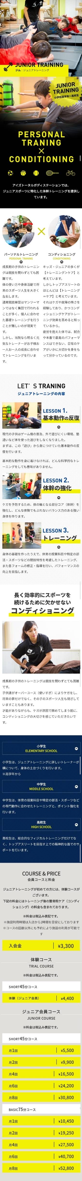 このプログラムでは、小学生から高校生までを対象に、パーソナルトレーニングとコンディショニングを組み合わせた指導を行っています。ただ体を鍛えるだけでなく、「正しく動ける体」をつくることを目的としています。